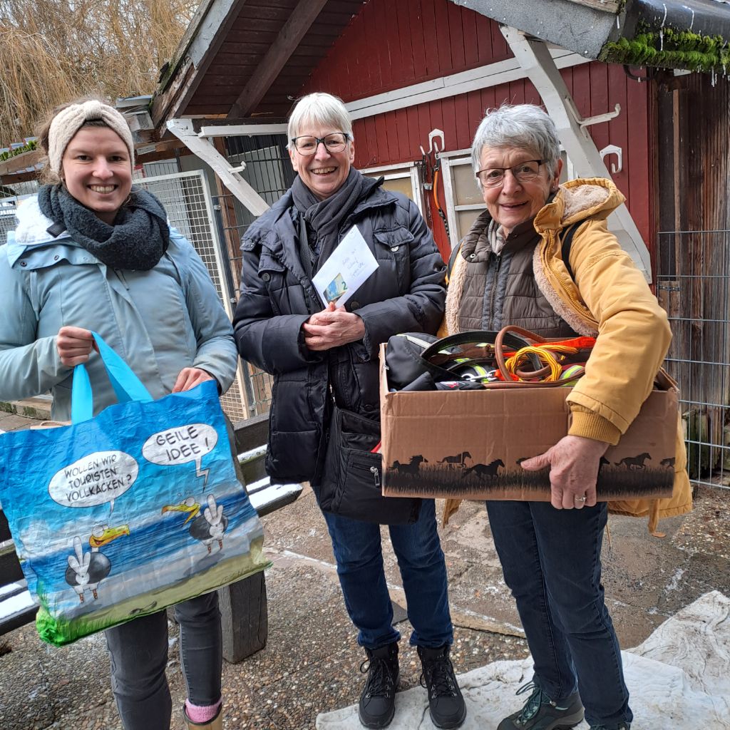 Spielsachen und Mäntelchen, sowie einer kleinen Geldspende, trafen sich (von rechts nach links) Irmi Stapp-Jost und Evelin Keim vom VdH Offenthal mit der engagierten Tierschützering Janine Kraft im Tierheim Egelsbach. Hier wurden die Sachen mit großer Freude entgegengenommen. |